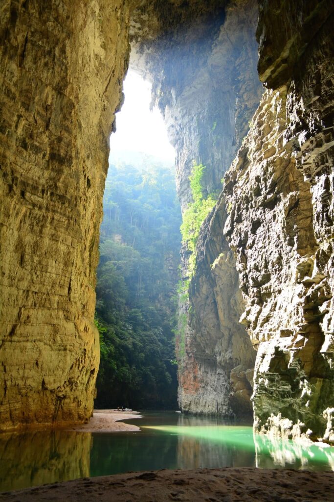 Ubicado en la Reserva de la Biósfera Selva El Ocote, el Cañón del Río La Venta es uno de los destinos más espectaculares y menos explorados de Chiapas. Con imponentes paredes de hasta 400 metros de altura, este cañón resguarda uno de los arcos naturales más grandes del mundo: el Arco del Tiempo, una formación rocosa de más de 180 metros de altura y 255 metros de ancho, esculpida por la naturaleza a lo largo de millones de años.